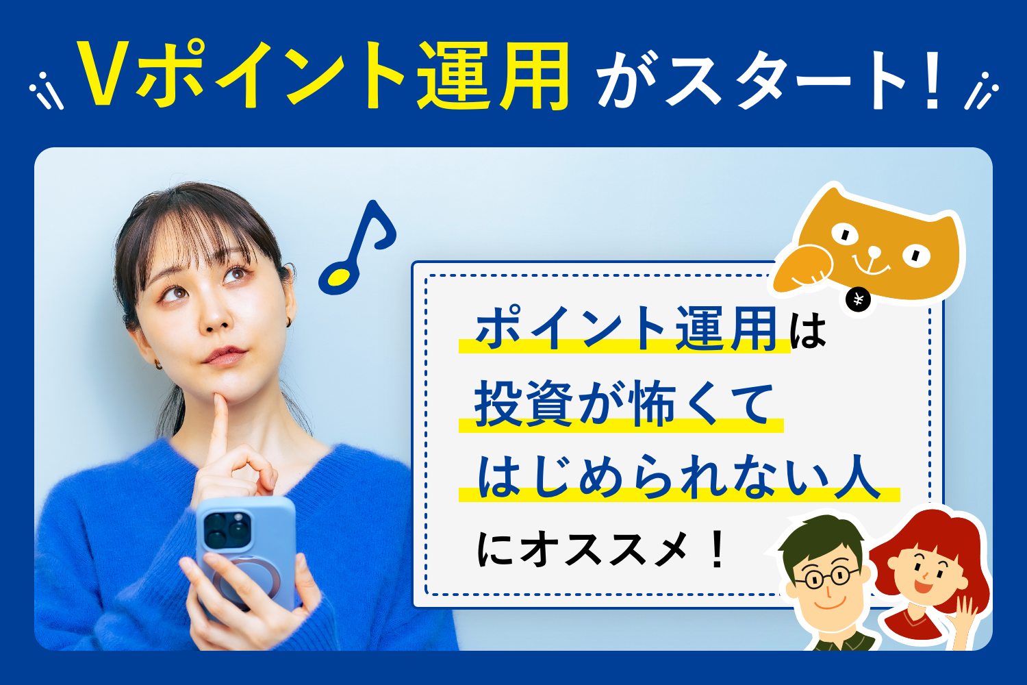 ポイント運用は、投資を始めたいけど怖いと思う人や、面倒に思っている人にぴったりのサービスだニャ。ポイント運用とはどんなものか、Vポイント運用の概要や特徴など、詳しく教えるニャン!