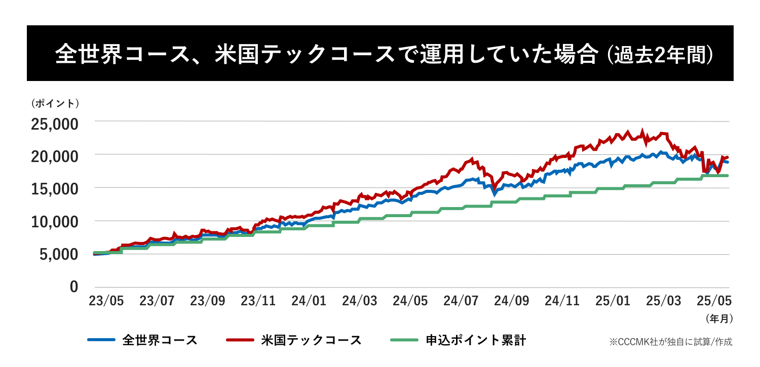 ここでは、人気ランキング上位の全世界コースと米国テックコースの 2つの運用コースで、もしも2023年5月から2年間運用していたらどのくらいポイントが増減したのかをシミュレーションをしてみるニャ!